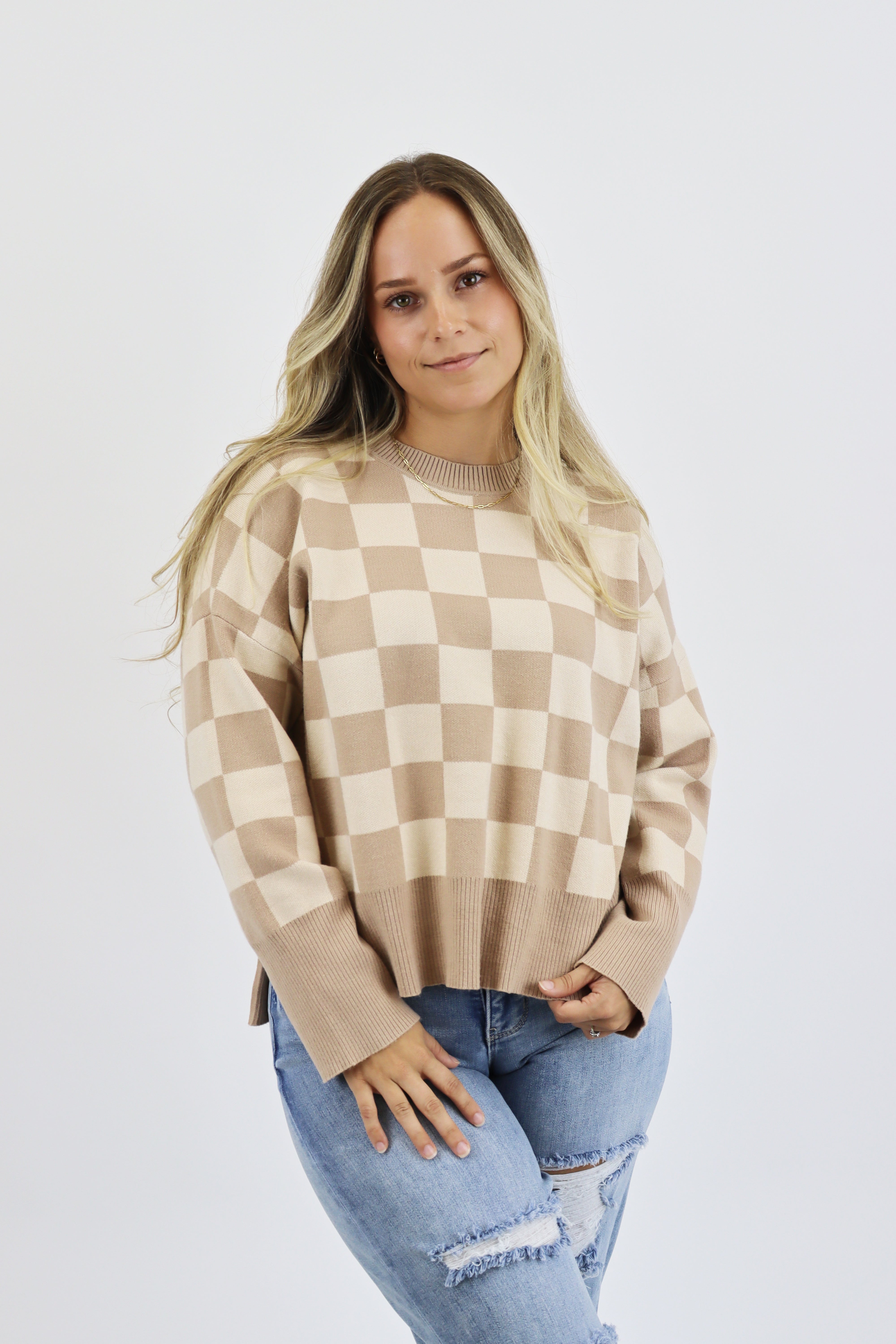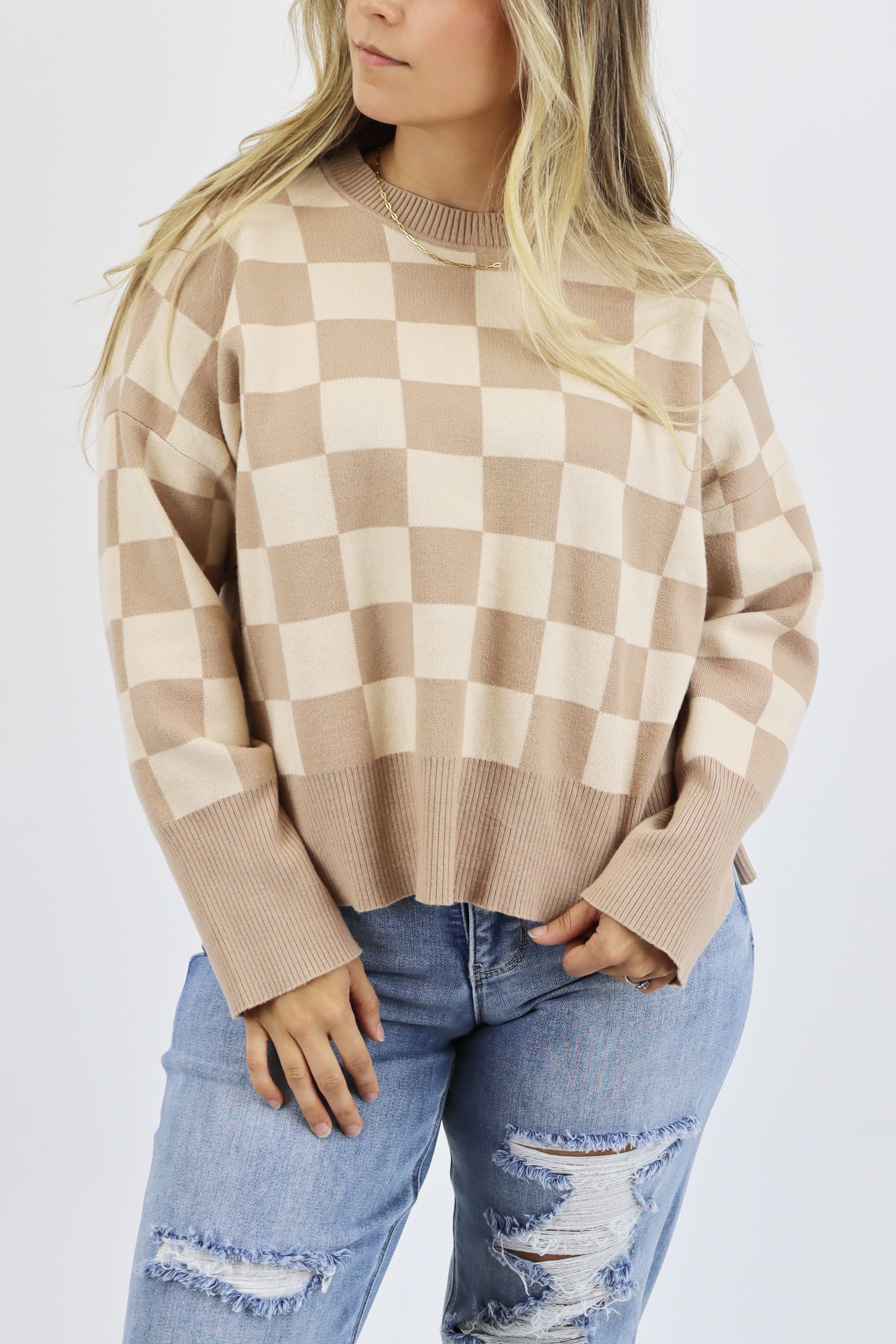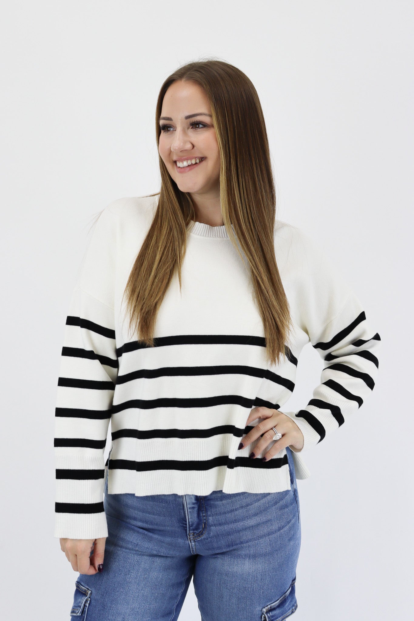 Get ready to stand out this season in the stylish Crewneck Sweater. Made from a luxurious medium-weight knit, this soft and cozy sweater is perfect for any occasion. Ribbed accents at the neckline, wrists, and hem add a touch of sophistication, while the semi-cropped length and subtle side slit create a flattering, easy-flowing shape.