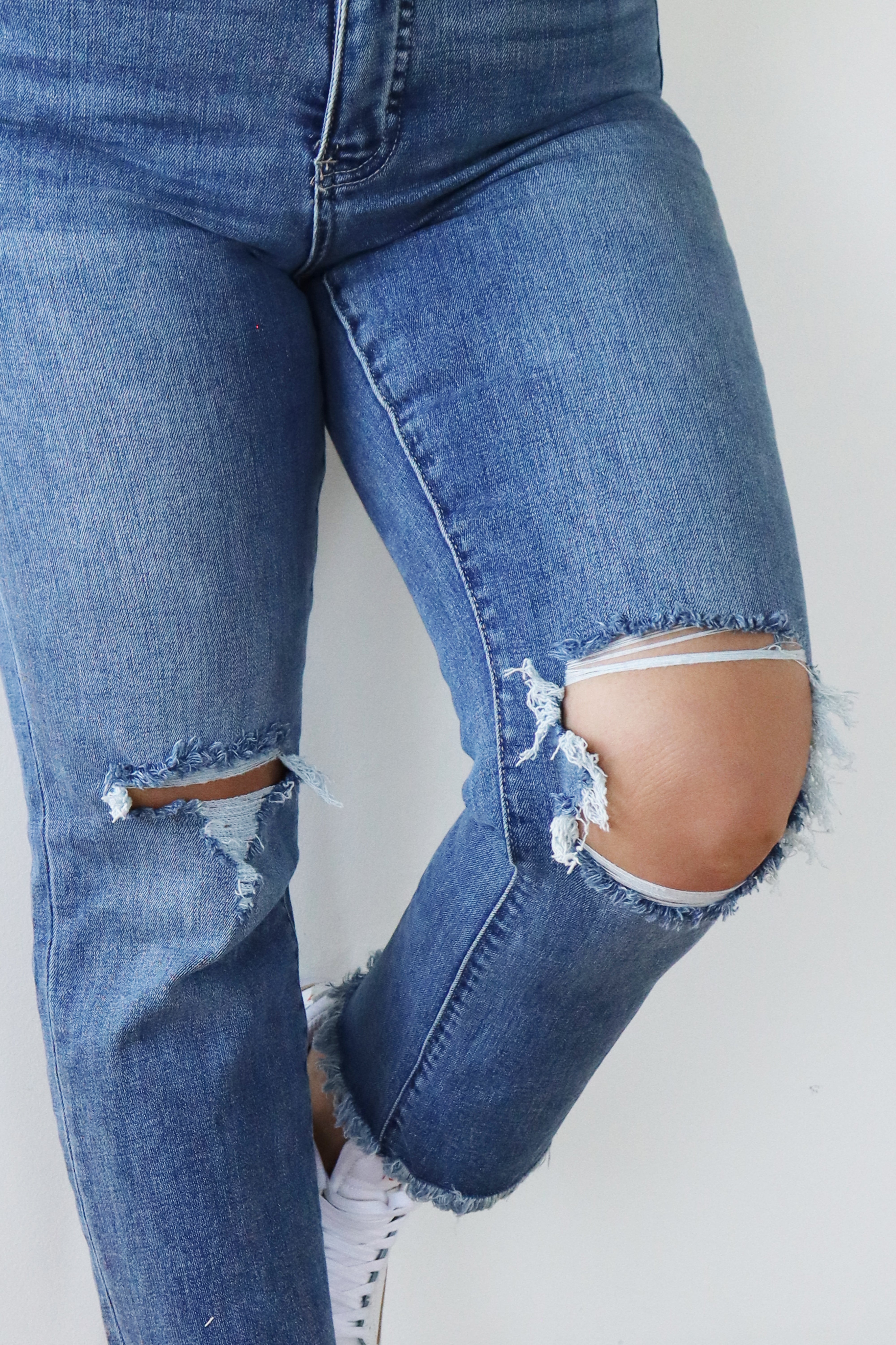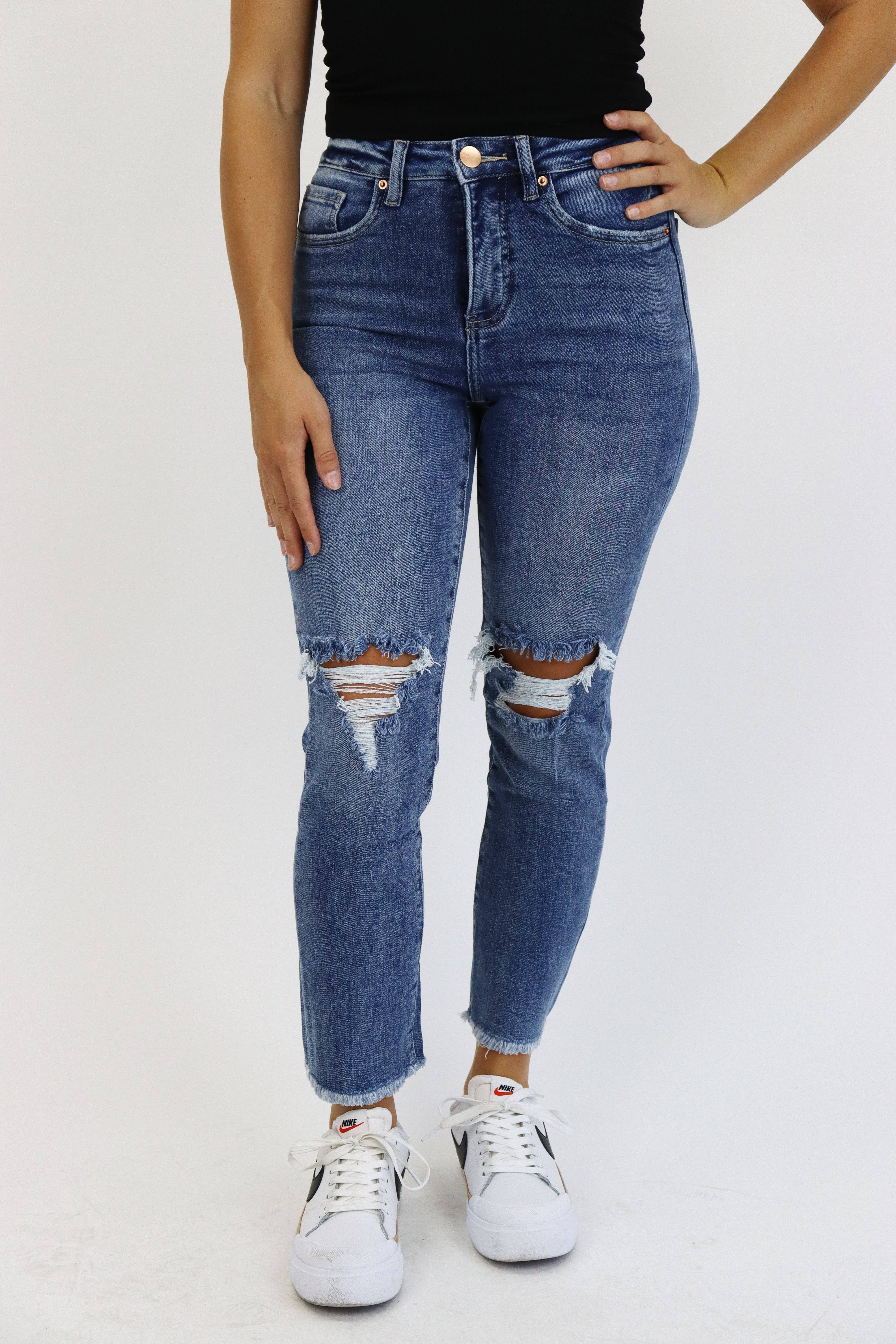 Ankle Crop Straight Jeans - Medium Stone Distressed
