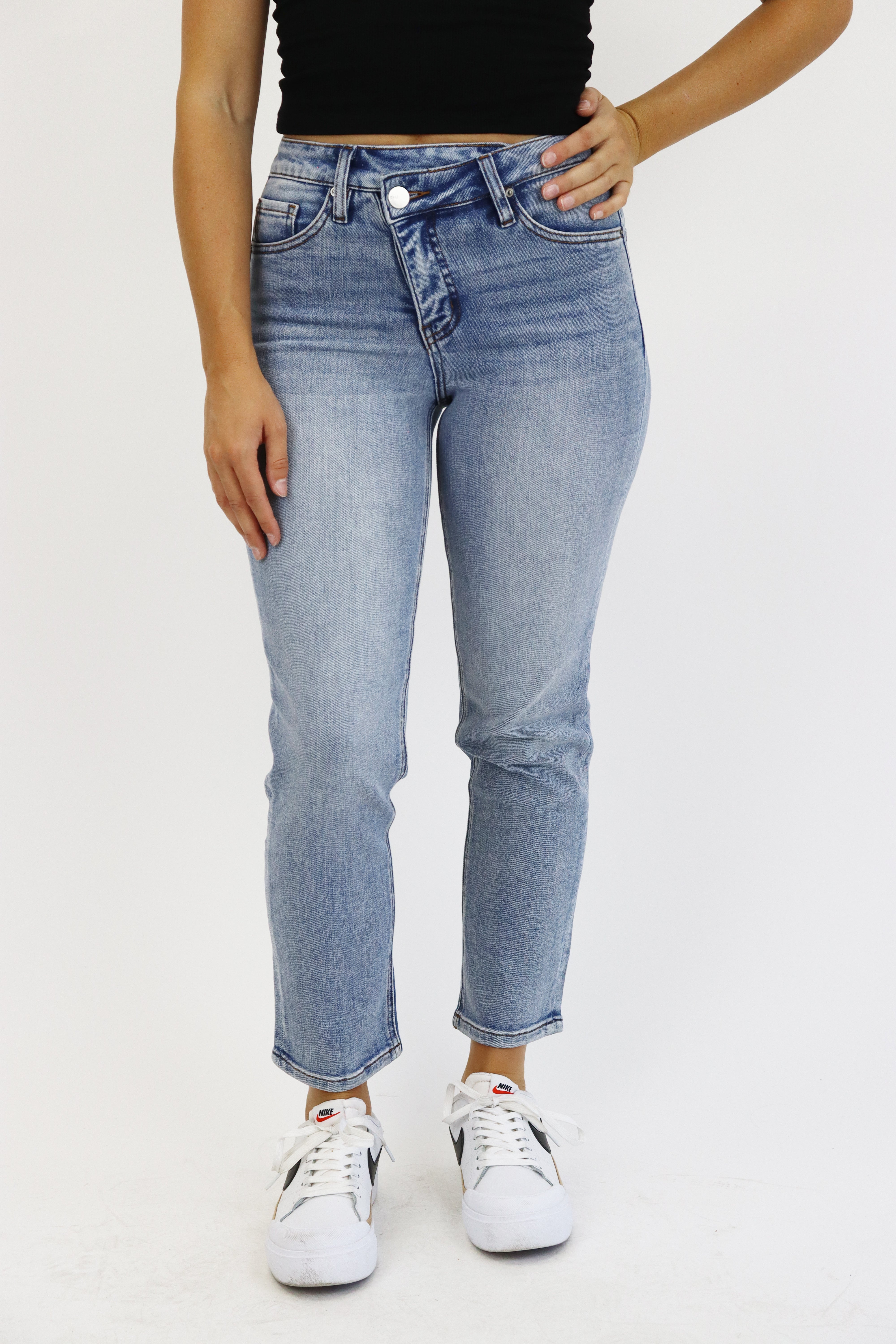 • Unique Cross Button Closure – Adds a fashion-forward edge to a classic jean.